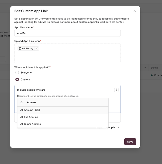 To ensure only admins can see the eduMe app link in Rippling, follow these steps: